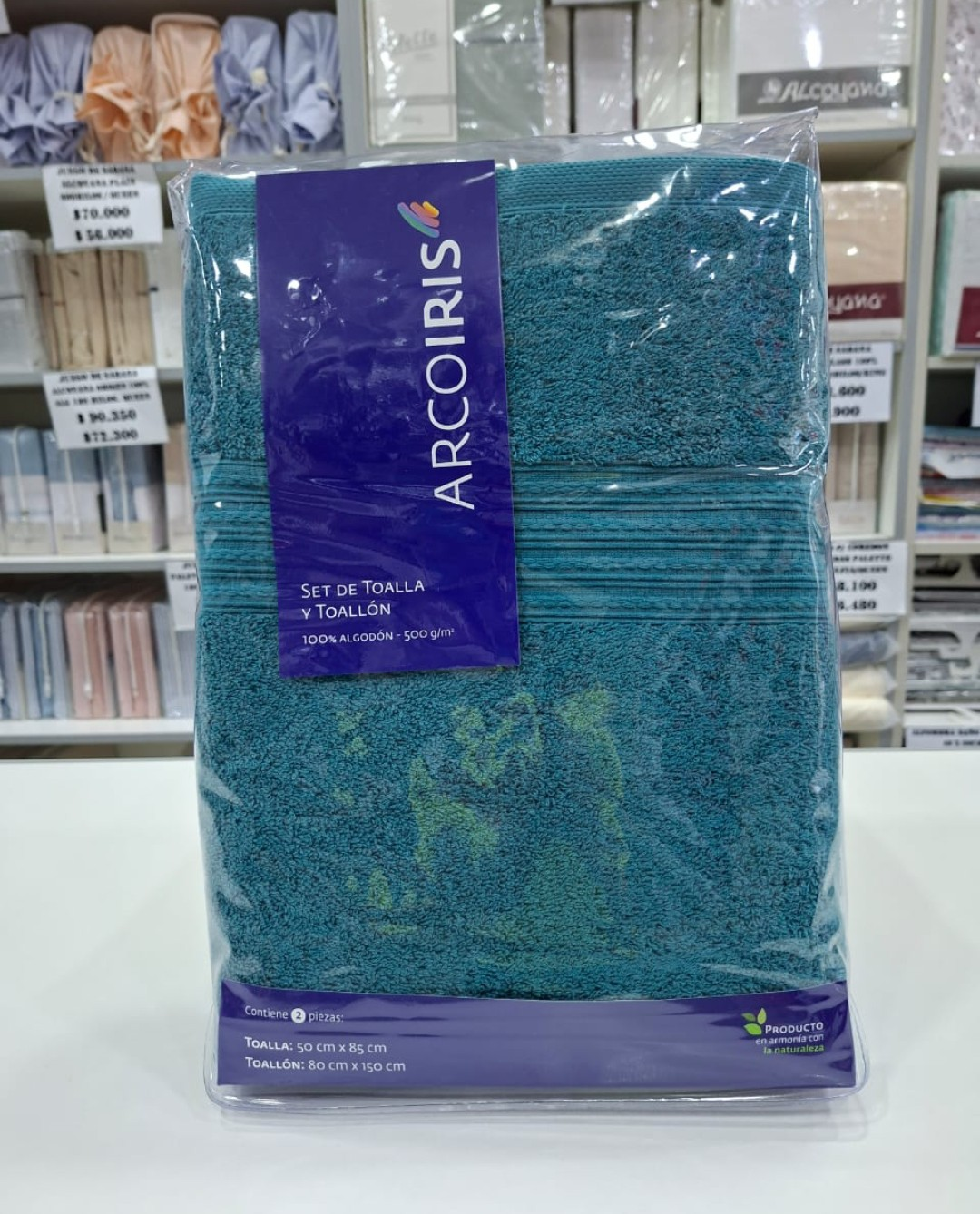 Juego De Toalla y Toallon Arcoiris Tim/Verde Petroleo. 500 Grs.100% Algodón/envase PVC.